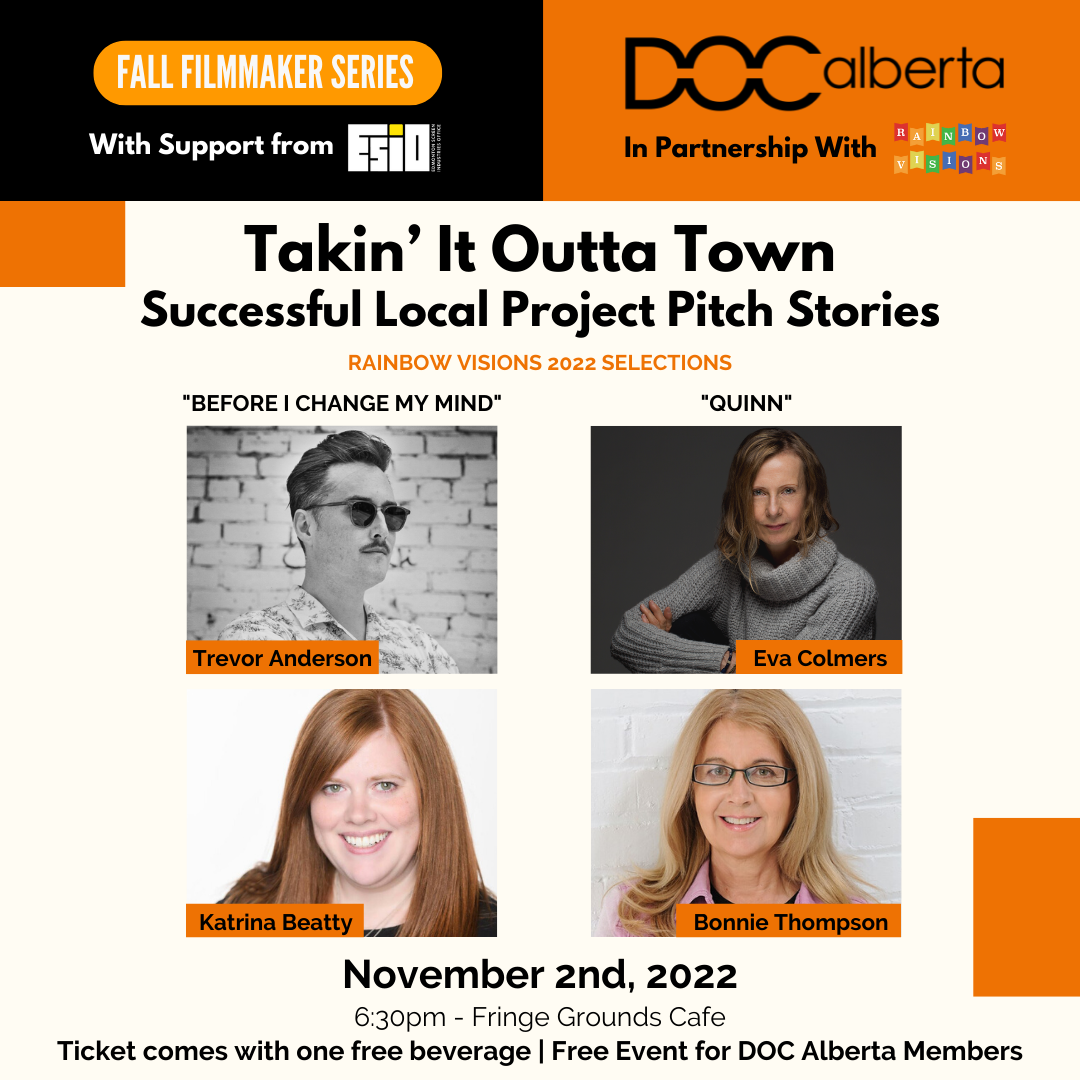 Hear from experienced filmmakers on how they planned, pitched, and promoted their stories to get outside of Edmonton. Learn what led to their success and hear about some of their struggles as well. Join DOC Alberta in-person as director Trevor Anderson discusses his dramatic feature film Before I Change My Mind, and Quinn director Eva Colmers shares her filmmaking experience.